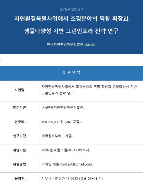 [공고] 연구 용역 입찰 공고 -자연환경복원사업에서 조경분야의 역할 확장과 생물다양성 기반 그린인프라 전략 연구